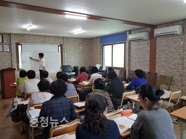 충남 홍성군이 충남 지자체 최초로 중학학력인정 문해교육 운영을 위한 보조금을 지원하는 등 평생교육 실현을 위한 성인문해 교육에 전폭적인 지원을 아끼지 않는 가운데 폭염도 이겨내는 늦깎이 배움의 열정이 타오르는 곳이 있다.