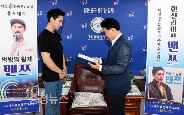 밴쯔는 유튜브에서‘먹방’(먹는 방송)으로 250만명의 구독자가 있는 파워 유튜버다. 중구에서 오랫동아 거주했던 인연과 인터넷상에서 구독자들과 직접 소통 하는 1인 미디어로 세대간 소통과 화합을 주제로 한 효문화뿌리축제 홍보에 딱 맞다는게 구 관계자 설명이다.