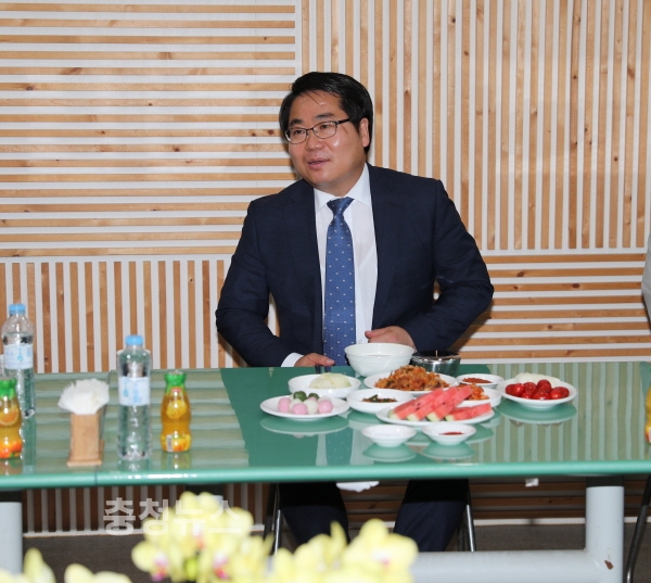 지난달 2일 민선 7기 아산시장 취임식 날 언론인 오찬 간담회에 참석한 오세현 아산시장 모습