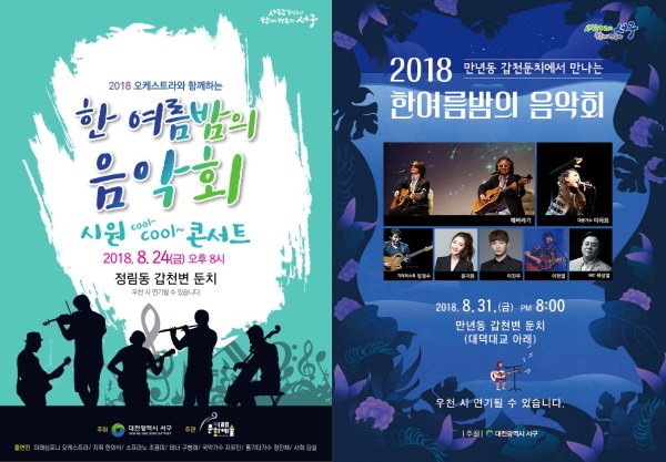 장종태 서구청장은 “시원한 갑천 변에서 펼쳐지는 이번 음악회에 가족․친구․연인과 함께 소중한 추억을 만드시길 바란다”고 말했다.