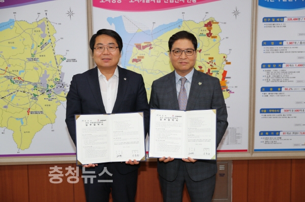 아산 선장일반산업단지 조성을 위한 업무협약식 모습 (사진 왼쪽부터) 오세현 아산시장, 윤창운 코오롱글로벌(주) 대표