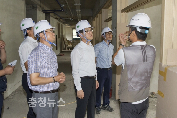 이승복 세종시교육청 부교육감이 2019년 3월 개원(개교)하는 복합형 직속기관인 세종교육원과 새빛초 공사현장을 찾아 시설공사 추진현황과 여름철 재해 대비 시설안전 점검상황에 대한 설명을 듣고 현장을 둘러보고 있다.