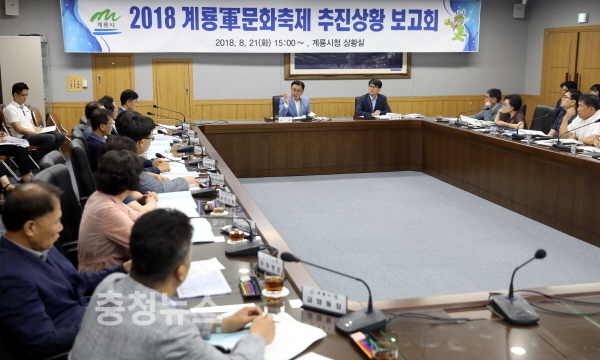 시는 21일 계룡시청 상황실에서 실・과・소장 및 주무팀장 등 30여명이 참석하여 ‘2018계룡軍문화축제 추진상황 보고회’를 개최하고 현재까지의 추진상황과 앞으로 추진방향을 점검했다.