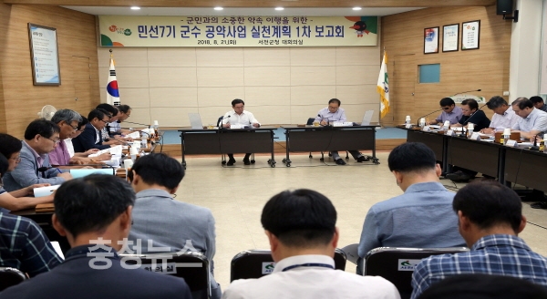 충남 서천군(군수 노박래)은 지난 21일 군청 대회의실에서 각 부서장 및 공약사업 담당 팀장 등 60여명이 참석한 가운데 ‘민선7기 군수 공약사업 실천계획 1차 보고회’를 개최했다.