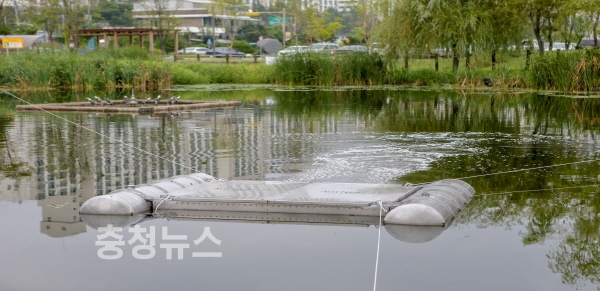 충남 천안시는 지난 21일 업성저수지 수변생태공원조성의 우선과제인 수질을 개선하기 위해 신방공원 호수에서 나노버블 수질개선시설 시연회를 열었다.