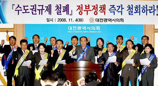 이에 우리 대전광역시의회 의원일동은 대전·충청권 주민 모두를 대표하여 수도권 규제의 빗장을 완전히 풀어헤친 이명박 정부의 ‘지방 죽이기 정책’을 강력히 저지해 나갈 것’이라고 강력히 촉구했다.