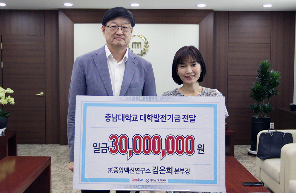 충남대 약학대학 총동문회와 ㈜중앙백신연구소 김은희 동문이 약학대학 발전기금을 기부했다.