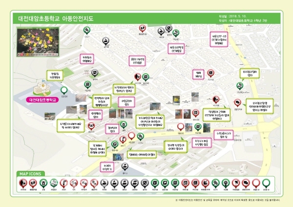 지도에는 학교 주변의 위험지역, 치안시설과 함께 위급상황 발생 시 유관기관 전화번호가 표시돼 있고, 소중한 우리 몸 함께 지켜요!, 우리아이 어른들이 지켜주세요! 등 효과적인 안전수칙이 담겨 있다.