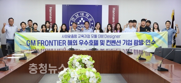 한남대 컨벤션호텔경영학과 학생들이 23일 싱가포르로 해외탐방을 떠나기 전 발대식을 갖고 있다.