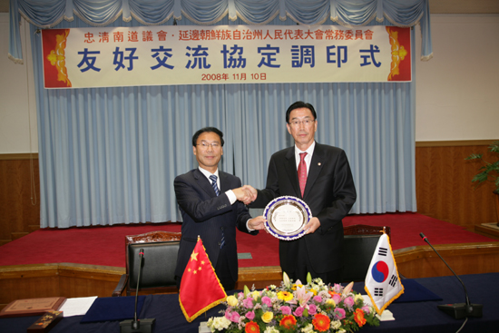 이날 충남도의회 강태봉의장과 옌벤주 인대 진숴런(金碩仁)주임은 우호교류협정서를 통해 충남도와 옌벤주 주민들 간 우의를 더욱 돈독히 하며 공동번영과 발전을 도모할 것임을 밝혔다.