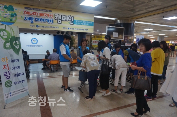 (사)대전소비자공익네트워크 (회장 도정자)는 한국에너지공단 대전충남본부(본부장 김주완)의 후원으로 28일 중앙로지하상가(선화동)에서 아지랑e(아끼자,지키자,사랑하자, energy) ‘에너지빼기 사랑더하기’캠페인을 전개했다.