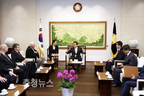 문희상 국회의장은 29일 오전 의장 접견실에서 미국 전직 의원단과 워싱턴 타임즈紙 대표단을 접견했다. 이번 접견은 최근 한반도의 상황에 입장을 공유하기 위해 이루어졌다.