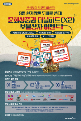 골프존뉴딘그룹 계열사 ㈜뉴딘플렉스(대표이사 송지헌)가 스크린 낚시공간 ‘피싱조이(FishigJOY)’ 전 매장에서 다음달 1일부터 30일까지 모바일 문화상품권을 최대 두 배로 증정하는 ‘추석맞이 앙코르 이벤트’를 진행한다.