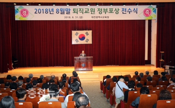 대전시교육청(교육감 설동호)은 지난 31일 시교육청 대강당에서 퇴직교원 가족과 교육관계자들이 참석한 가운데 2018년 8월말 퇴직교원 정부포상 전수식을 개최했다.