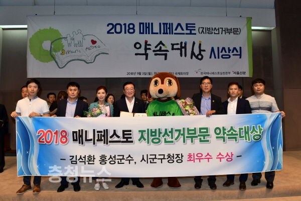 김석환 홍성군수가 3일 한국프레스센터 국제회의장에서 개최되고 한국매니페스토 실천본부(이하 매니페스토본부)와 서울신문이 공동 주최하는 ‘2018 매니페스토(지방선거 부문) 약속대상’에서 선거공약서 분야 최우수상을 수상했다.