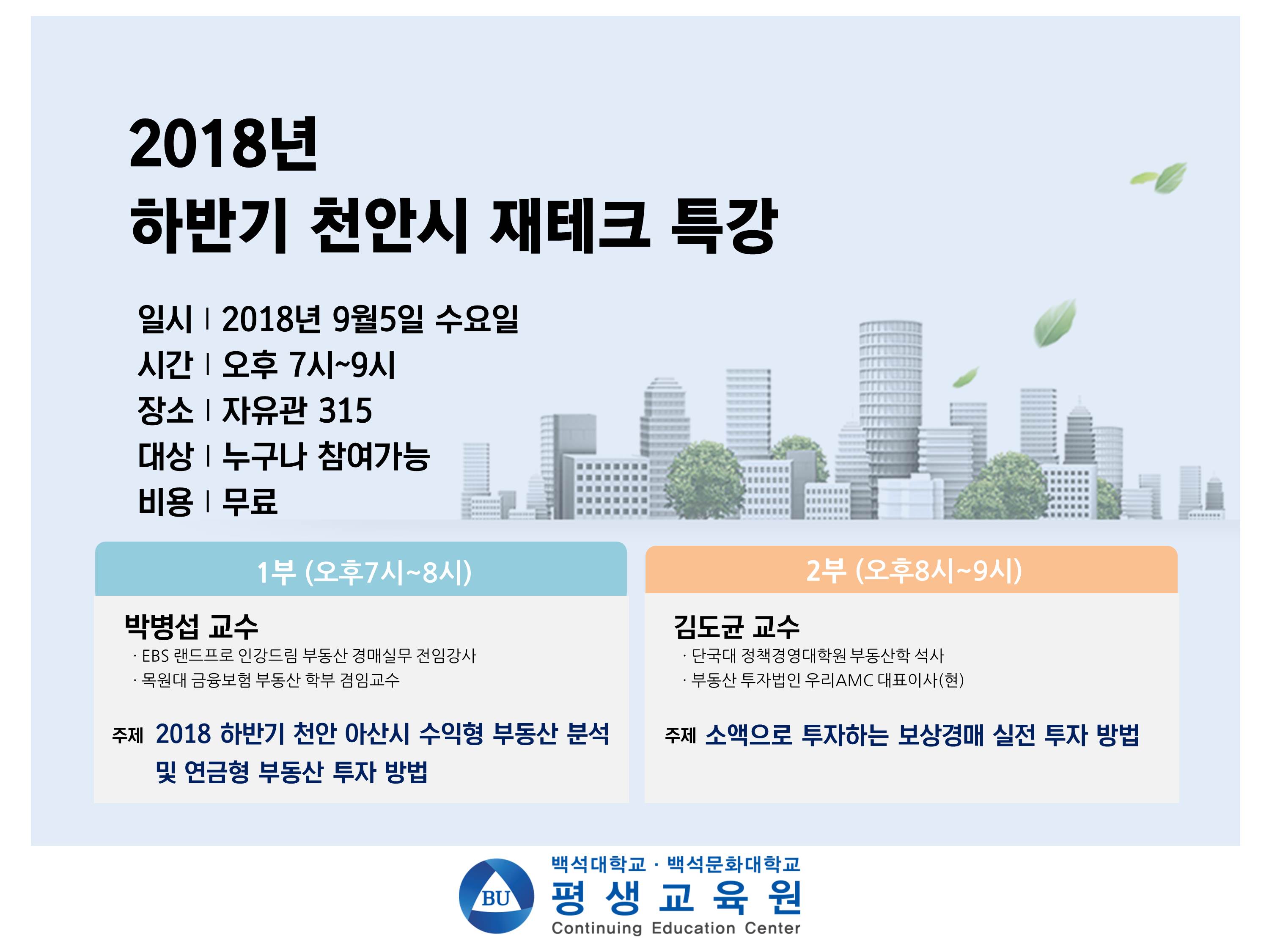 백석대학교(총장 장종현)ㆍ백석문화대학교 평생교육원은 5일 오후 7시부터 9시까지 교내 자유관 315호에서 ‘2018 하반기 천안시 재테크 특강’을 개최한다.