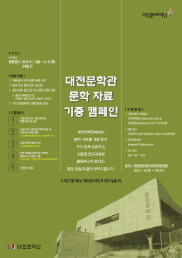 이번 캠페인은 대전 문학 자료의 체계적인 관리를 통해 대전의 문학사를 정립하고, 대전 문학의 경쟁력 강화를 위해 개인 혹은 단체가 소장하고 있는 문학 자료에 대한 관심 증대와 기증 참여를 이끌어 내고자 기획 되었다.