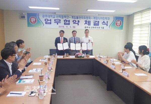 업무협약식은 공주대 산학협력단 서창호 단장, 게임물관리위원회 이재홍 위원장, 게임디자인학과 이동엽 학과장 등 관계자가 배석한 가운데 협약을 체결했다.