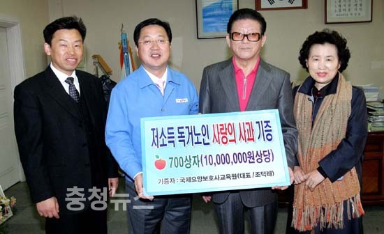 대전 동구 정동 소재 국제노인복지센터(대표 조덕래)에서는 17일 지역 어려운 어르신들에게 전달해 달라며 동구청(구청장 이장우)에 사과 700상자(싯가 1천만원 상당)를 기증했다.