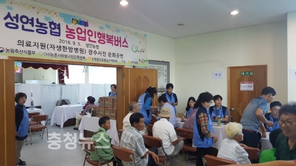 5일 농업인행복버스는 서산시 성연농협 회의실에서 자생한병병원 의료봉사단 10여명이 한방진료, 침치료, 약처방 등 200여명의 고령농업인들을 치료하고, 장수사진 촬영 및 신명나는 문화공연도 함께 진행하여 조용한 시골마을에 활기를 불어넣었다.