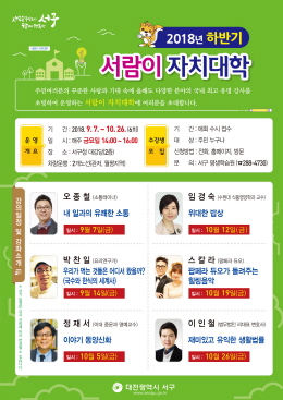 서구청 관계자는 “서람이 자치대학은 다양한 지식과 정보제공으로 주민의 자기계발을 이끌어온 서구민의 대표 평생학습의 장으로, 2018년 하반기 서람이 자치대학에도 구민들의 많은 관심과 참여를 바란다”고 말했다.