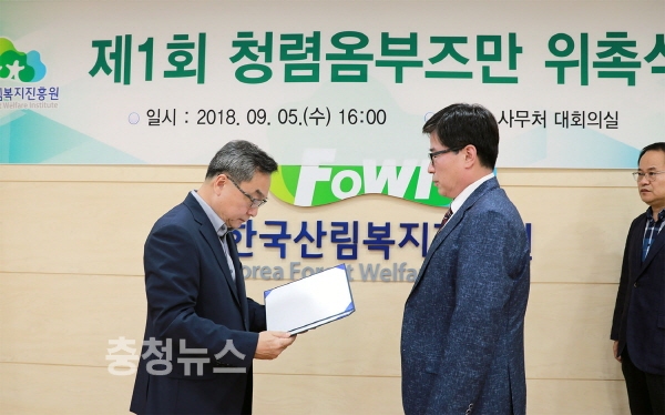 산림청 한국산림복지진흥원(원장 윤영균, 이하 진흥원)은 5일 대전 사무처 대회의실에서 주요 정책사업의 투명성을 위해‘제1기 한국산림복지진흥원 청렴 옴부즈만(시민감사관) 위원 위촉식’을 했다고 밝혔다.