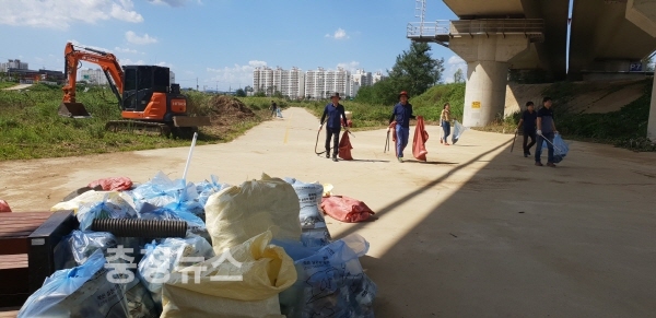 이날 환경정비는 건설과 전 직원과 배방읍 직원 및 지역주민 100여명이 참여해 지난달 27일 시간당 55㎜의 집중호우로 곡교천 생태하천 고수부지에 떠내려 온 나뭇가지, 페트병, 스티로폼 등 각종 쓰레기를 수거했다.