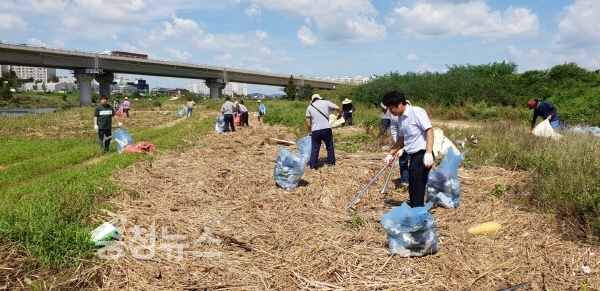 충남 아산시 건설과(과장 김문수)는 지난 5일 집중호우로 하천에 떠밀려온 쓰레기를 제거하기 위해 곡교천 일대에서 환경정비 활동을 실시했다.