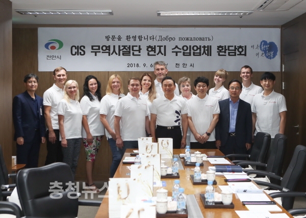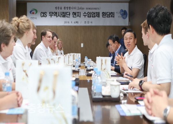 지난 6일 구본영 천안시장은 지난해 파견했던 CIS 지역 무역사절단 중 노부메디칼을 방문한 CIS 지역 현지 수입업체 기업인들을 만나 환담을 하며 사후 마케팅을 강화하는 활동을 펼쳤다