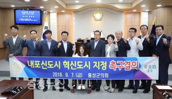 충남 홍성군의회가 7일 '내포신도시 혁신도시 지정을 촉구 결의안'을 통해 충남도에서 세종시 분리에 따른 인구 감소, 경제발전 소외 등의 문제점을 지적하고 정부의 적극적인 검토를 요구했다.