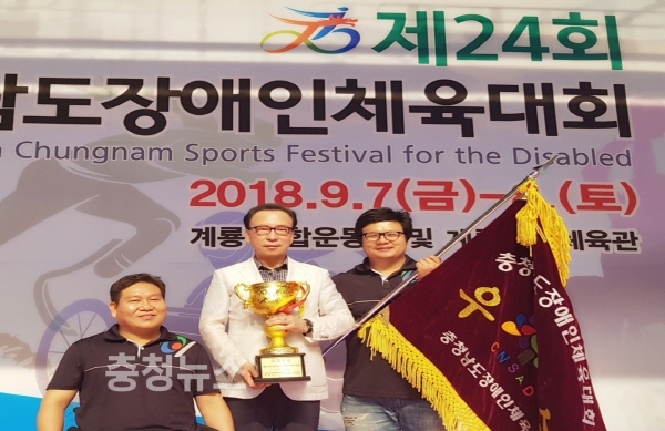 ‘제24회 충청남도장애인체육대회’에서 종합 우승을 차지해 박승복 체육진흥과장이 트로피를 받아 기념사진을 찍고 있다.