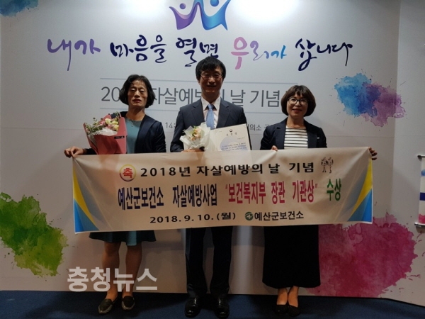 충남 예산군보건소는 10일 보건복지부 주관으로 대한상공회의소에서 열린 2018년 자살예방의 날 기념식에서 보건복지부장관 기관상을 수상했다.