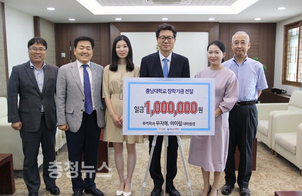 충남대 무역학과 우지에(吳杰), 이이림(李怡霖)씨는10일, 오덕성 총장을 방문해 무역학과 장학기금으로 써 달라며 100만 원을 전달했다.