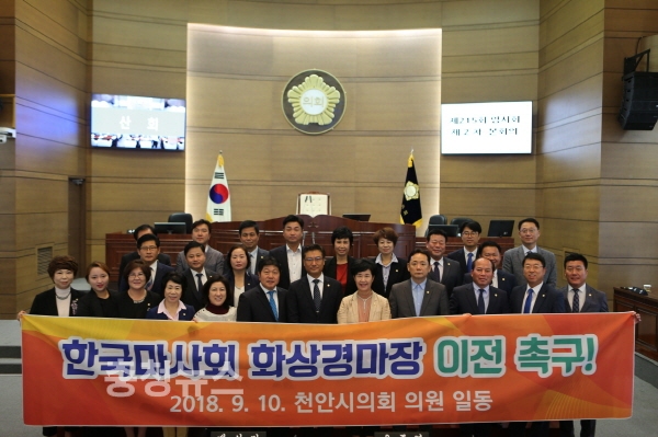 천안시의회(의장 인치견)는 10일 제215회 임시회 제2차 본회의에서 현재 두정동에 있는 한국마사회 화상경마장을 시 외곽으로 이전할 것을 촉구 하는 내용의 건의문을 만장일치로 채택했다.