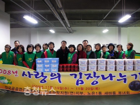 유성구 노은1동(동장 이태복)은 20일 새마을부녀회원과 공공연구노동조합원 등 20여명이 참여한 가운데 사랑의 김장담그기 행사를 갖고 생활이 어려운 40여세대에 김장김치를 전달했다.