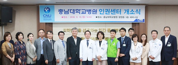 인권센터 개소식. 왼쪽부터 이나미(서울대학교병원 인권센터장), 임정섭(청주대학교 학생종합상담센터장), 박미영(법무법인 유엔아이 변호사), 문은현(국가인권위원회 대전인권사무소장), 손종학(충남대학교 법학전문대학원 교수), 김형태(법무법인 저스티스 변호사), 민윤기(충남대학교 인권센터장), 송민호(충남대학교병원 병원장), 유재현(충남대학교병원 인권센터장), 최재홍(충남대학교병원 노동조합지부장), 전득배(충남대학교병원 상임감사), 이상재(대전충남인권연대 사무국장), 손민균(충남대학교병원 진료처장), 허성주(서울대학교병원 인권센터 상담실장), 김지연(충남대학교병원 기획조정실장), 서경원(충남대학교병원 사무국장)