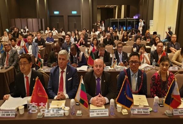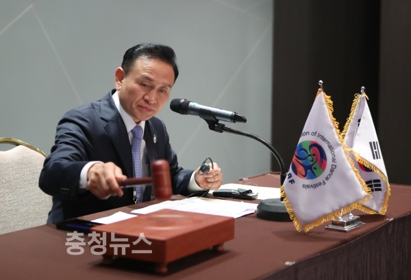 13일 오후 서울 워커힐 호텔에서 열린 '국제춤축제연맹' 세계총회에서 구본영 총재가 안건을 심의, 의결하고 있다.