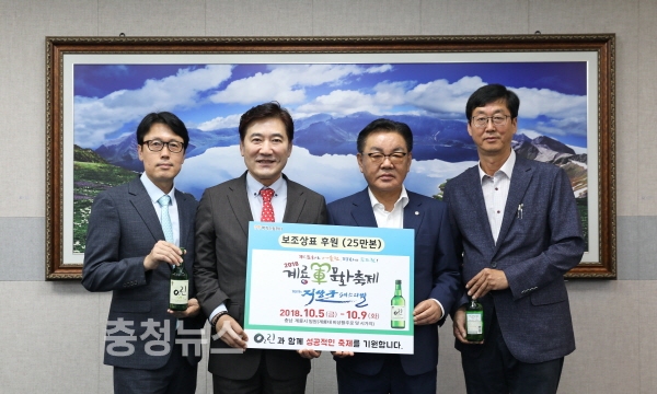 계룡시는 13일 박근태 사장이 시청을 방문해 제11회 ‘계룡군문화축제’ 홍보를 적극 지원하기로 하고 O₂린 소주병 보조라벨 전달식을 가졌다고 밝혔다.