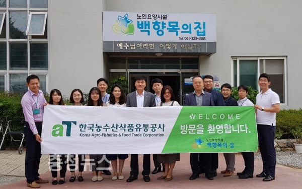 한국농수산식품유통공사(aT, 사장 이병호)는 민족최대 명절인 추석을 맞아 지난 11일 전남 함평군 소재 노인요양시설인 “백향목의 집”을 찾아 후원금을 전달하고 봉사활동을 펼쳤다.