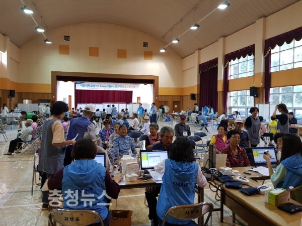 금번 진료봉사활동은 의사 8명, 간호사 8명, 약사, 임상병리사 등 서울대병원 의료진 35명이 내과, 가정의학과, 정형외과, 산부인과, 안과, 재활의학과, 영상의학과, 이비인후과 등 8과목에 대해 세심하게 진료를 펼쳐 진료장을 찾은 농업인들로부터 큰 호응을 얻고 있다.