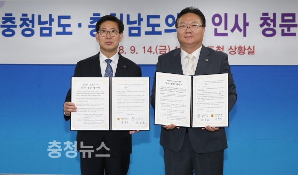 양승조 지사는 14일 도청 상황실에서 유병국 도의회 의장과 ‘인사청문 협약’을 체결했다.
