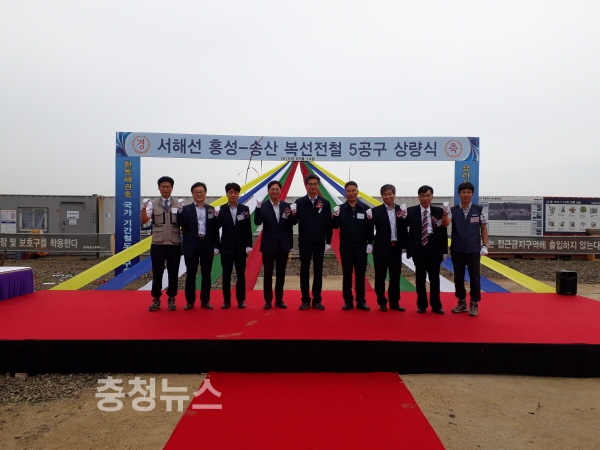 철도공단 장봉희 충청본부장(왼쪽 5번째)과 공사 관계자들이 서해선 복선전철 아산고가의 상부 공사를 착수하는 상량식에서 기념포즈를 취하고 있다.