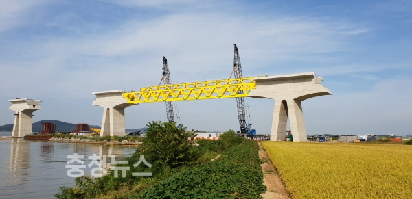 한국철도시설공단 충청본부(본부장 장봉희)는 서해선(홍성∼송산) 복선전철(연장 90.01km) 구간 중 안성천(아산호)을 횡단하는 아산고가의 상판 거치를 14일 시작했다고 밝혔다.