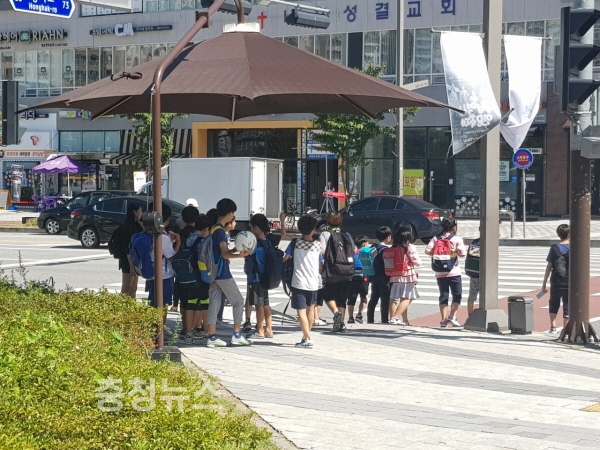 충남 홍성군 신도시시설관리사업소는 지난 14일 주민들이 무더위를 피할 수 있도록 횡단보도 앞에 그늘막 11개를 추가로 설치했다.