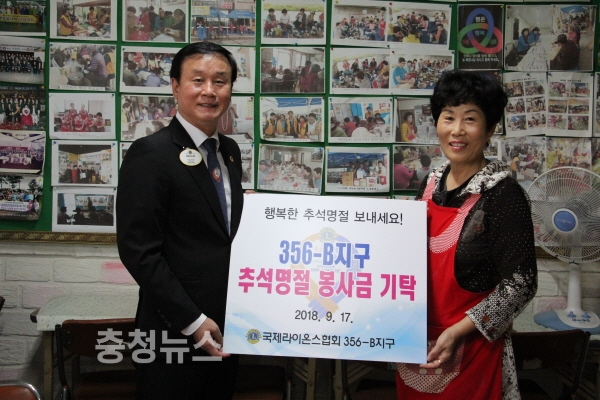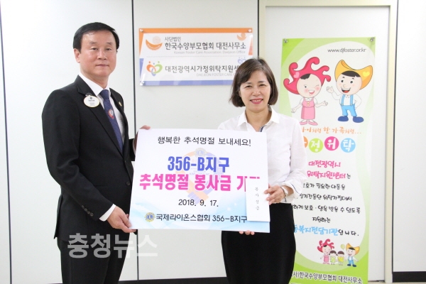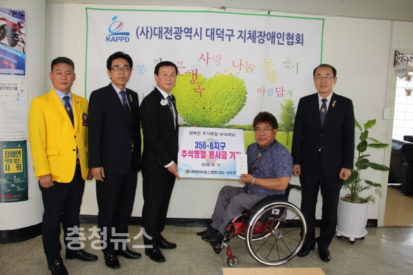 국제라이온스협회 356-B(대전)지구 김홍호 총재는 17일 추석을 맞이해 대덕구지체장애인협회, 용봉사회복지원, 대전가정위탁지원센터 등을 각각 방문하여 금일봉의 봉사성금을 기탁했다.