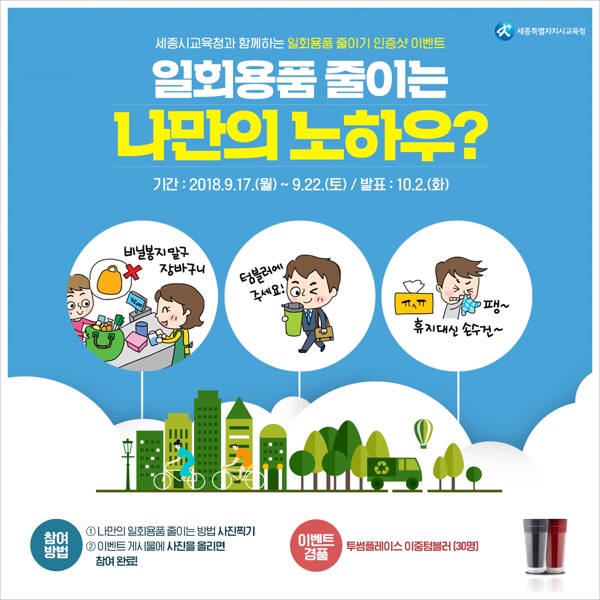 참가를 희망하는 자는 일회용품을 줄이는 자신만의 노하우를 사진으로 찍어 세종시교육청 공식 페이스북 이벤트 게시글에 댓글로 달면 되며, 이벤트의 상품으로 텀블러를 지급할 예정이다.