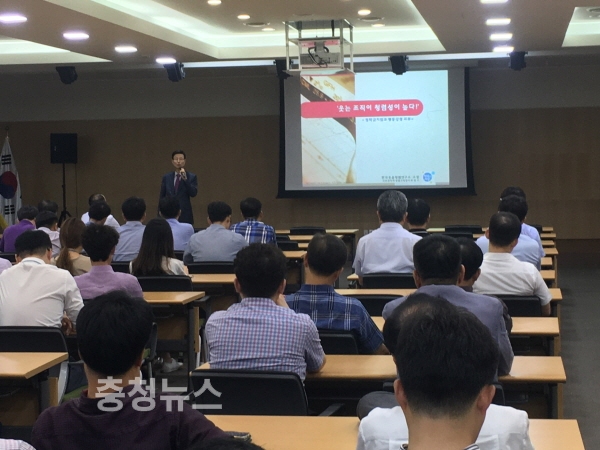 한국웃음청렴연구소 최정수 소장이 철도공단 임직원들에게 '웃는 조직이 청렴성이 높다'라는 주제로 특별강의를 하고 있다.