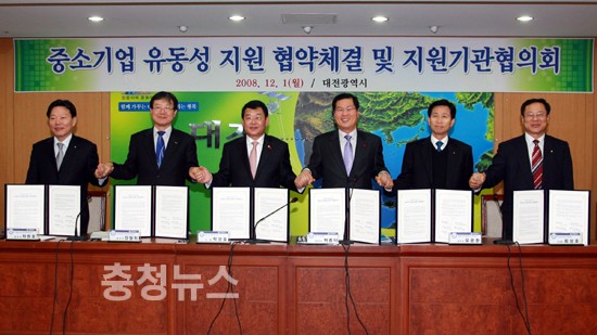 이날 오후 박성효 대전시장 외에 박종덕 하나은행 대전지역본부장, 오윤환 농협대전지역본부장, 차원호 신용보증기금 충청영업본부장, 강철희 기술보증기금 충청지역본부장, 최성호 대전신용보증재단이사장 등이 참석해 '지역중소기업 유동성 지원을 위한 기본협약'을 체결했다