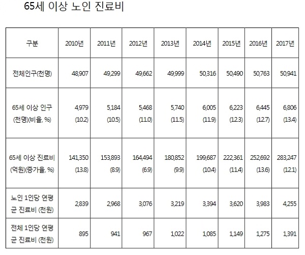 전체 건보 진료비 가운데 지난해 65세 이상 진료비는 28조 3247억 원으로 2016년 보다 12.1% 증가했다. 이들의 1인당 평균 진료비 역시 건강보험 적용인구 진료비(139만원)의 3배에 달했다.