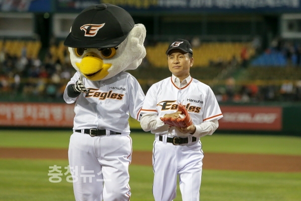 구본영 천안시장이 지난 27일 대전 한화이글스파크에서 열린 한화이글스와 두산베어스의 KBO 프로야구 경기에서 ‘2018 대한민국 국제농기계자재박람회’ 성공 개최 기원과 홍보를 위해 시구를 했다.